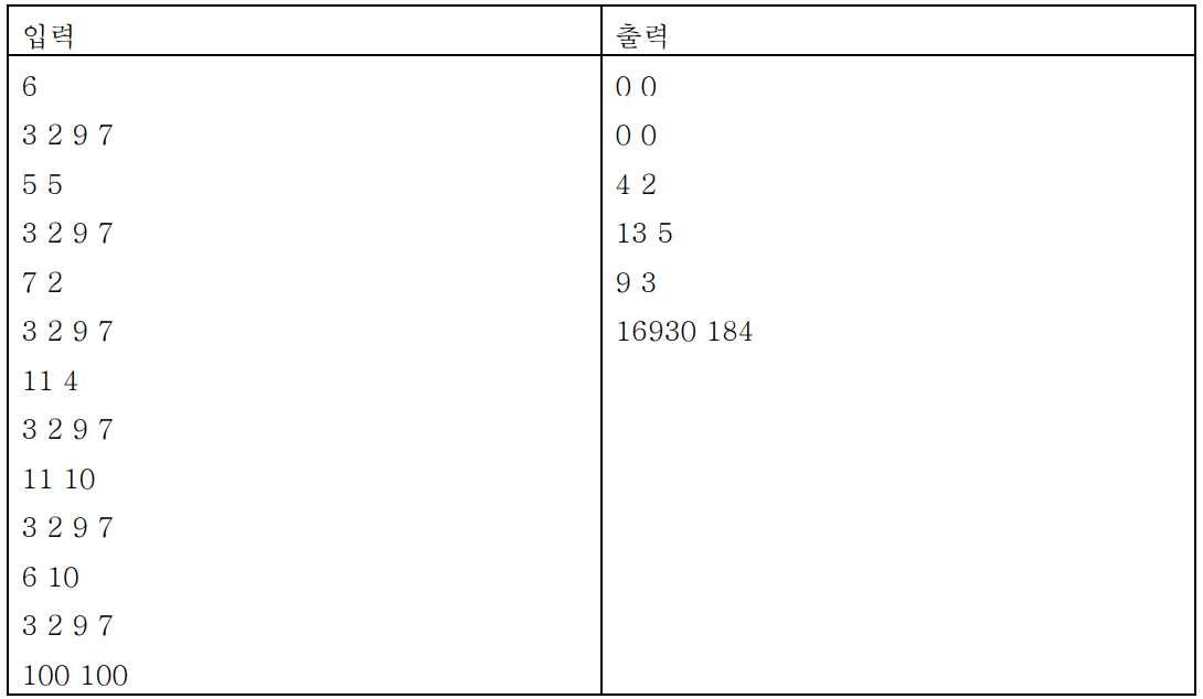 각 테스트 케이스의 출력되는 첫 줄에 입력되는 사각형과 점과의 직선거리의 제곱을 나타내는 정수와 직각거리를 나타내는 정수를 순서대로 출력한다.