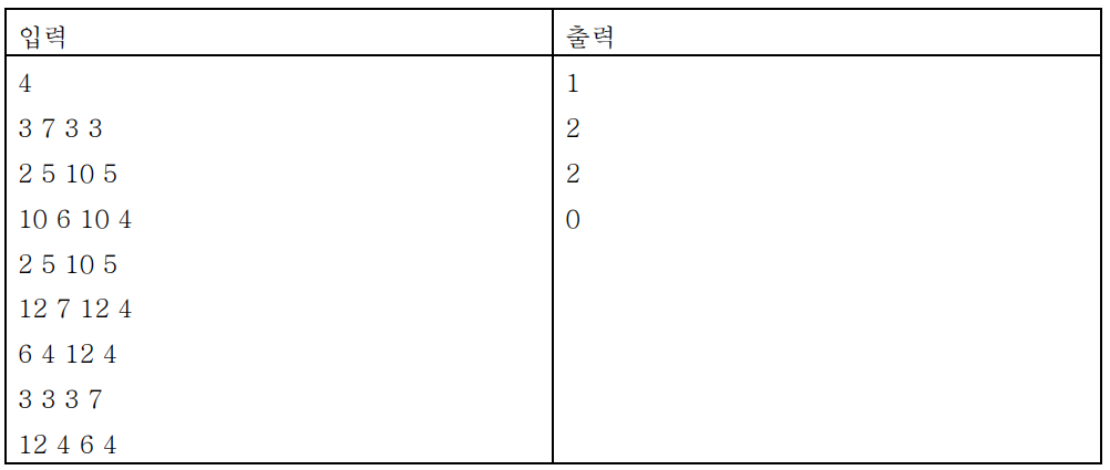 사각형의 위치는 네 개의 정수 x1 y1 x2 y2 (0 ≤ x1 < x2 ≤ 1,000, 0 ≤ y1 < y2 ≤ 1,000) 로 표시되며, (x1, y1) 은 사각형의 왼쪽 아래 꼭지점의 좌표이며, (x2, y2) 는 사각형의 오른쪽 위 꼭지점의 좌표이다.