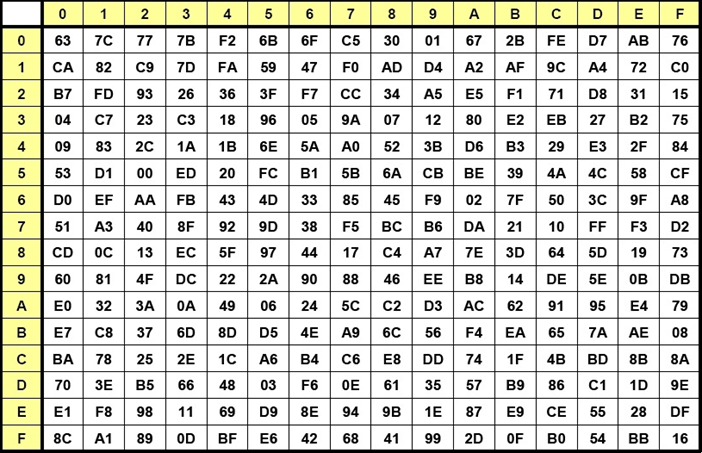 Sbox = [ 0x63, 0x7c, 0x77, 0x7b, 0xf2, 0x6b, 0x6f, 0xc5, 0x30, 0x01, 0x67,